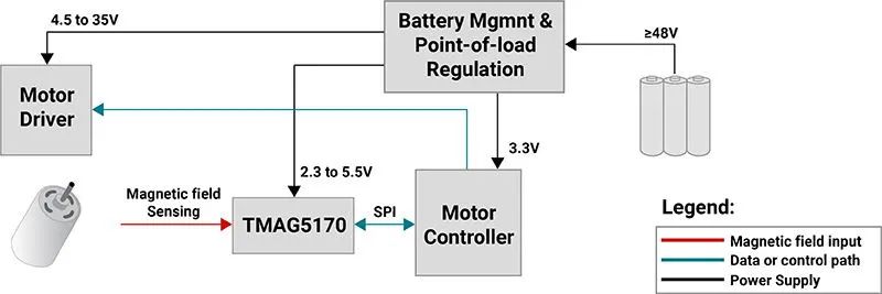 圖 2:采用TMAG5170線性3D霍爾效應(yīng)位置傳感器的自主移動機器人輪子電機模塊方框圖