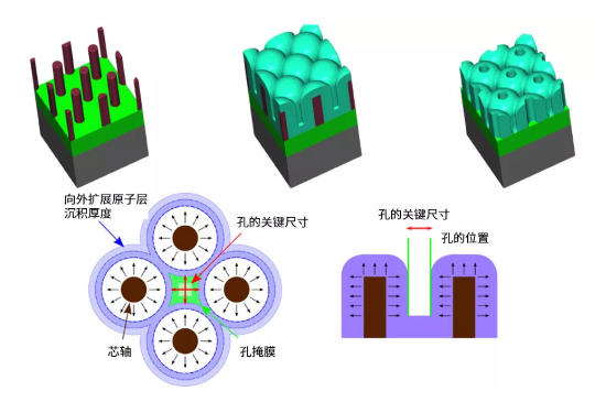 圖4:孔陣列上的菱形SADP,芯軸直徑20nm,水平間距80nm。處于擴(kuò)張的向外沉積形成了孔,這些孔又形成菱形并具有圓形開口。使用剖面SiO2刻蝕,可以探索不同ALD厚度刻蝕孔的形狀。